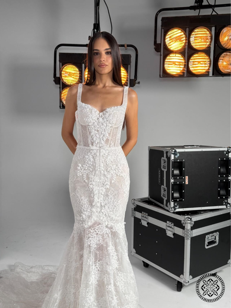 שמלת כלה בגזרת בת הים עם מחוך מובנה, כתפיים חשופות וכתפיות דקיקות ועדינות. המחוך כולל מבנה פנימי מחטב וקאפים, המבטיחים התאמה מושלמת ותמיכה מלאה לגוף.